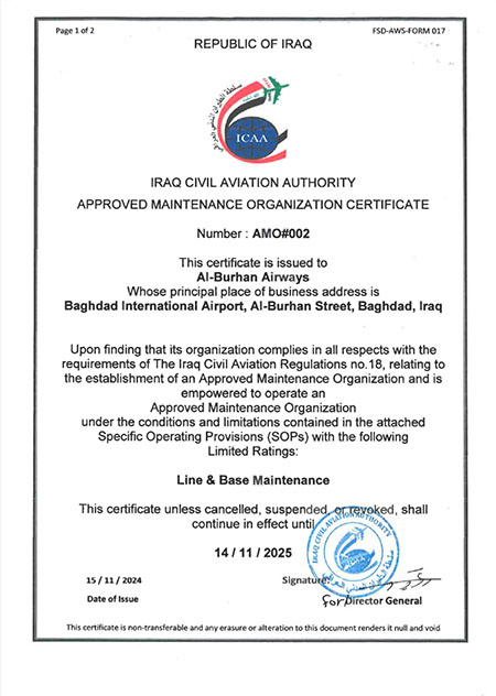 At Al-Burhan Airways, we are proud to be Iraq’s first and only ICAA-approved helicopter maintenance organization. Certified under ICAA Authorization No. #002 and in full compliance with ICAR Regulation No. 18 and EASA Part 145, we provide comprehensive line and base maintenance services for different helicopter types—including Airbus AS 350 and Leonardo AW109 helicopters—ensuring both heavy and light maintenance needs are met around the clock.